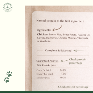 - Review guaranteed analysis (protein, fat, fibre percentages)